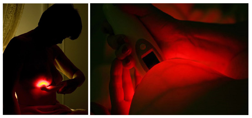 - 鏡のある部屋で照明を完全に消し、ブレストライトを胸に密着させて光を照射します。