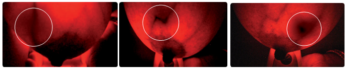 - 光が当たった部分が赤く半透明に映ります。正常な静脈や血管は、暗い線のように映ります。4段階の輝度設定がありますので、血管がはっきりと見えるように明るさを調整します。光が弱すぎると胸に血管が映りません。光が強すぎると細部まではっきり見ることができません。