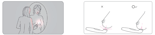 - 直接見下ろしたり鏡に映したりしながら、胸全体をチェックしてください。変化があった際にすぐ気付けるよう、ご自身の正常な状態をよく覚えておいてください。