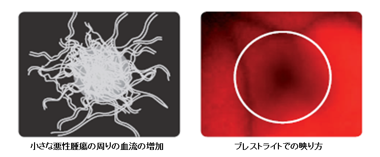 早期の悪性腫瘍では、腫瘍の周りに血管が増殖することが認められています。ブレストライトでは血管が多く集まっている部分は暗い影のように映るので、悪性腫瘍の周りに増殖した血管も暗く映ります。よってこの影を「異常の疑い」として検知することができます。