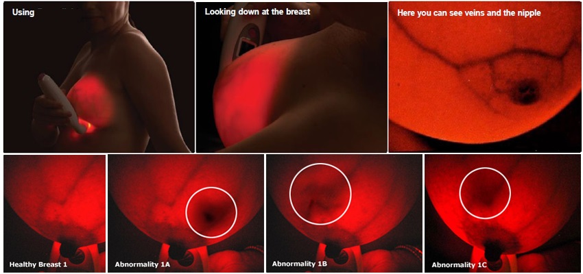 注)がんが原因でない血流の増加や血腫なども同様に映ります。ブレストライトは診断機器ではありませんので、必ず医師の診断を受けてください。